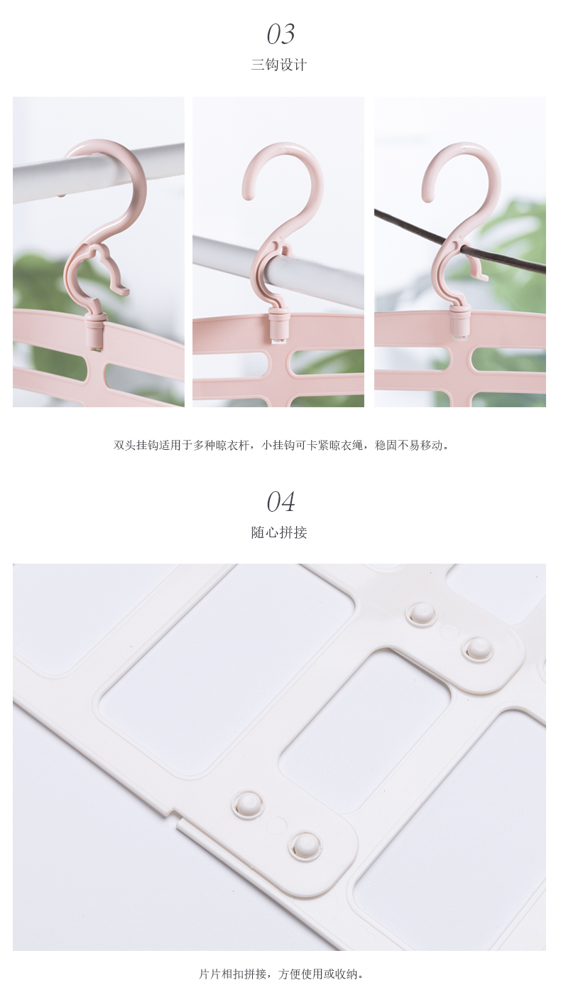 3、三鉤設(shè)計:雙頭適應(yīng)多種衣桿,小掛鉤可卡緊